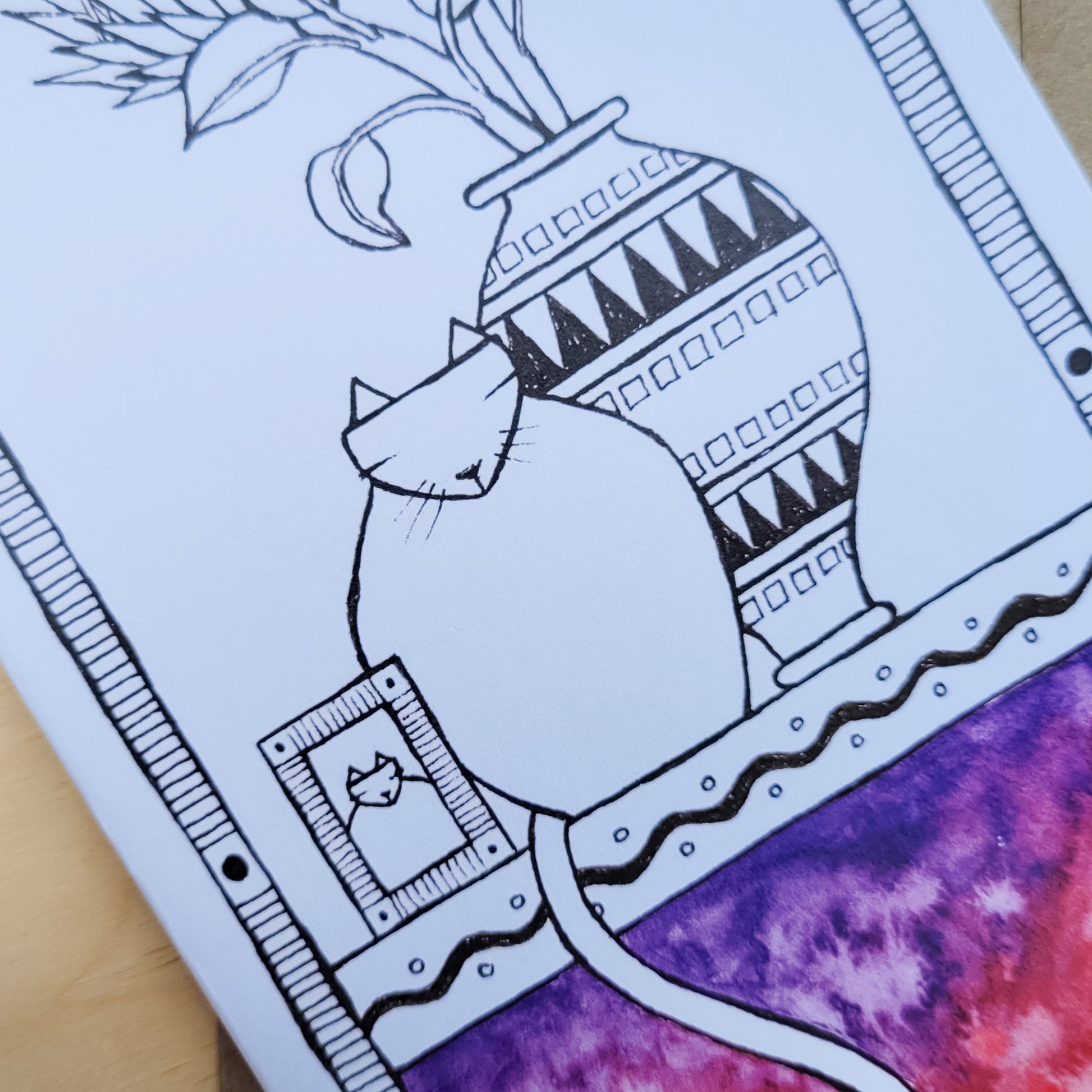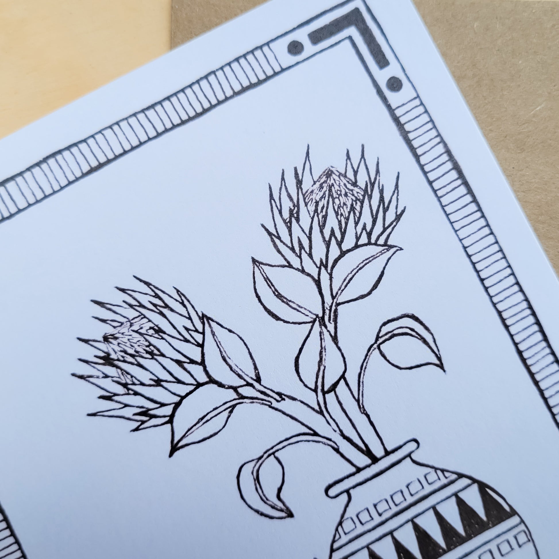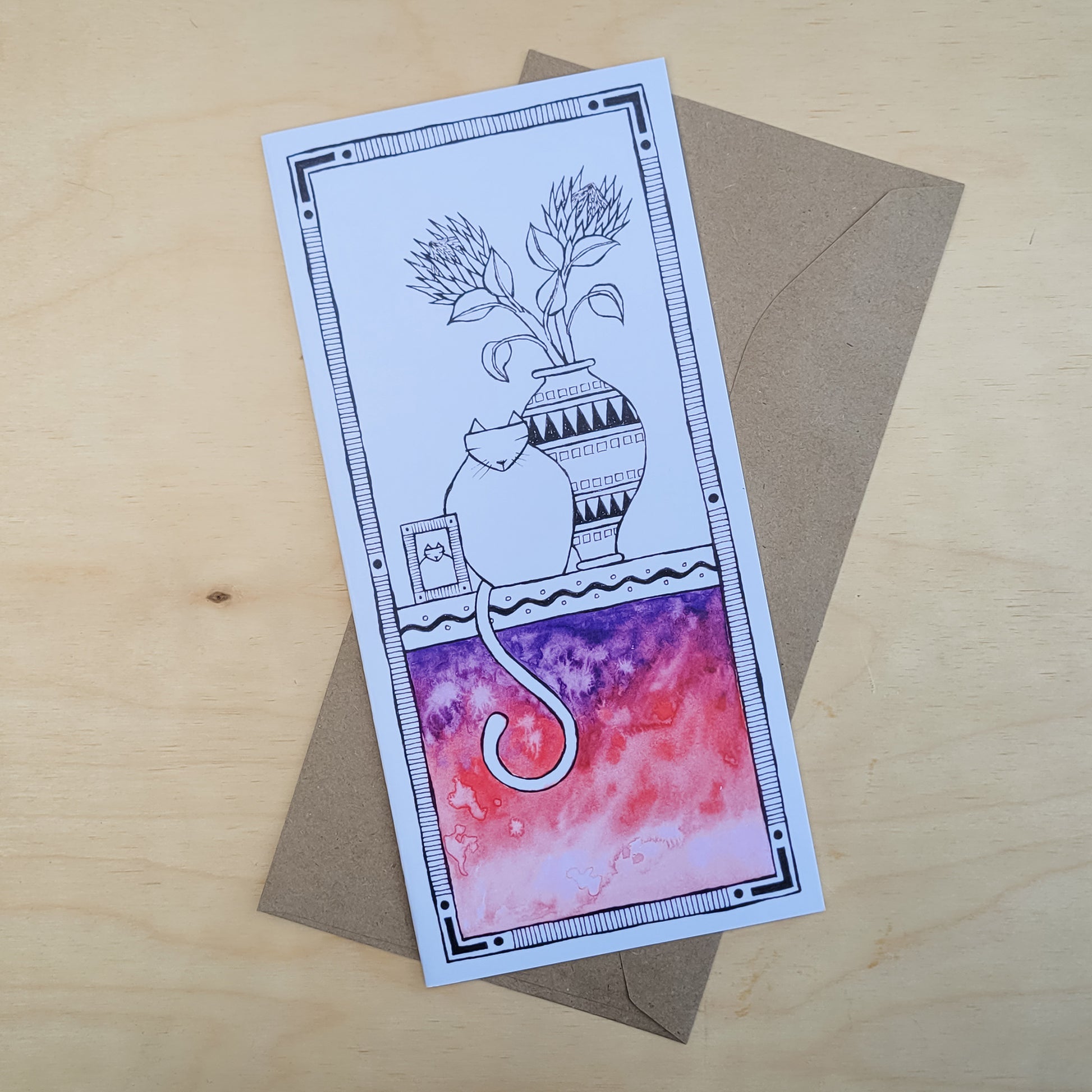 Blank, DL, folded greeting card featuring a whimsical watercolour and pen illustration of an adorable fat cat, posing next to his own portrait, with a bouquet of King Proteas - South Africa's national flower.