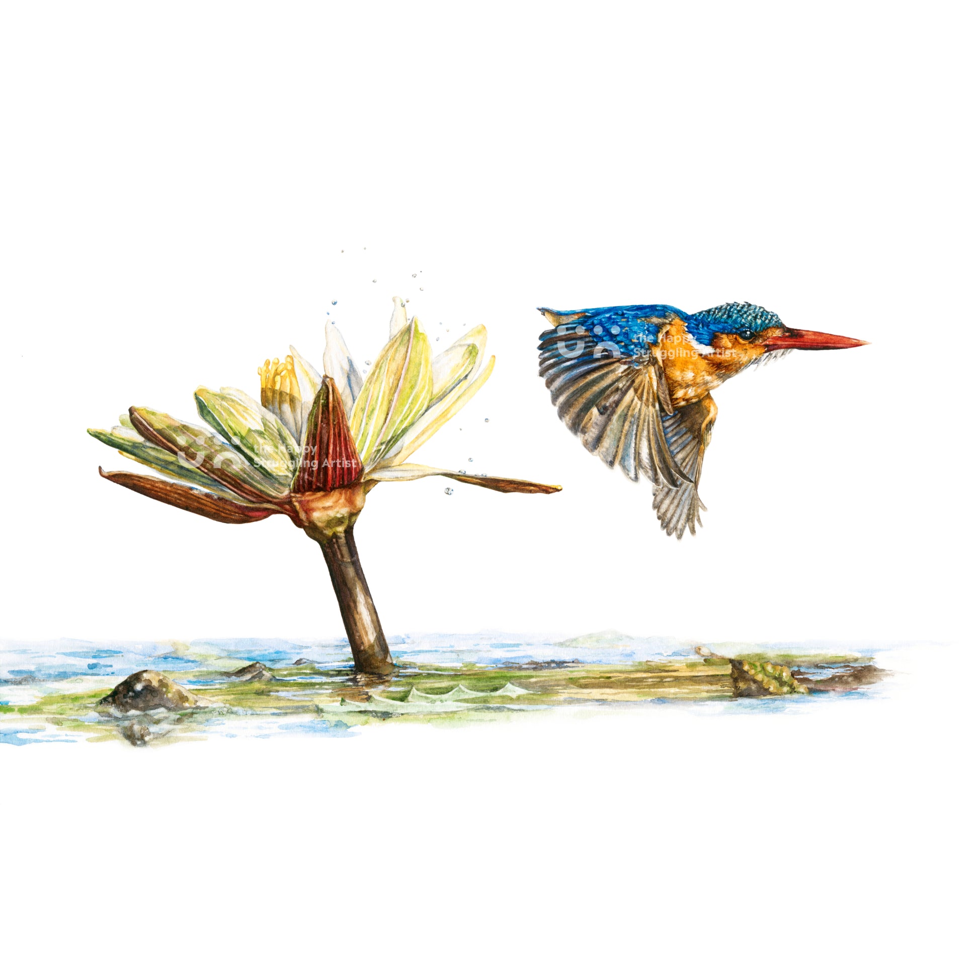 Fine art print of my watercolour painting, entitled Lift off, featuring a photo-realistic rendition of a Malachite kingfisher, taking off from a water lily.