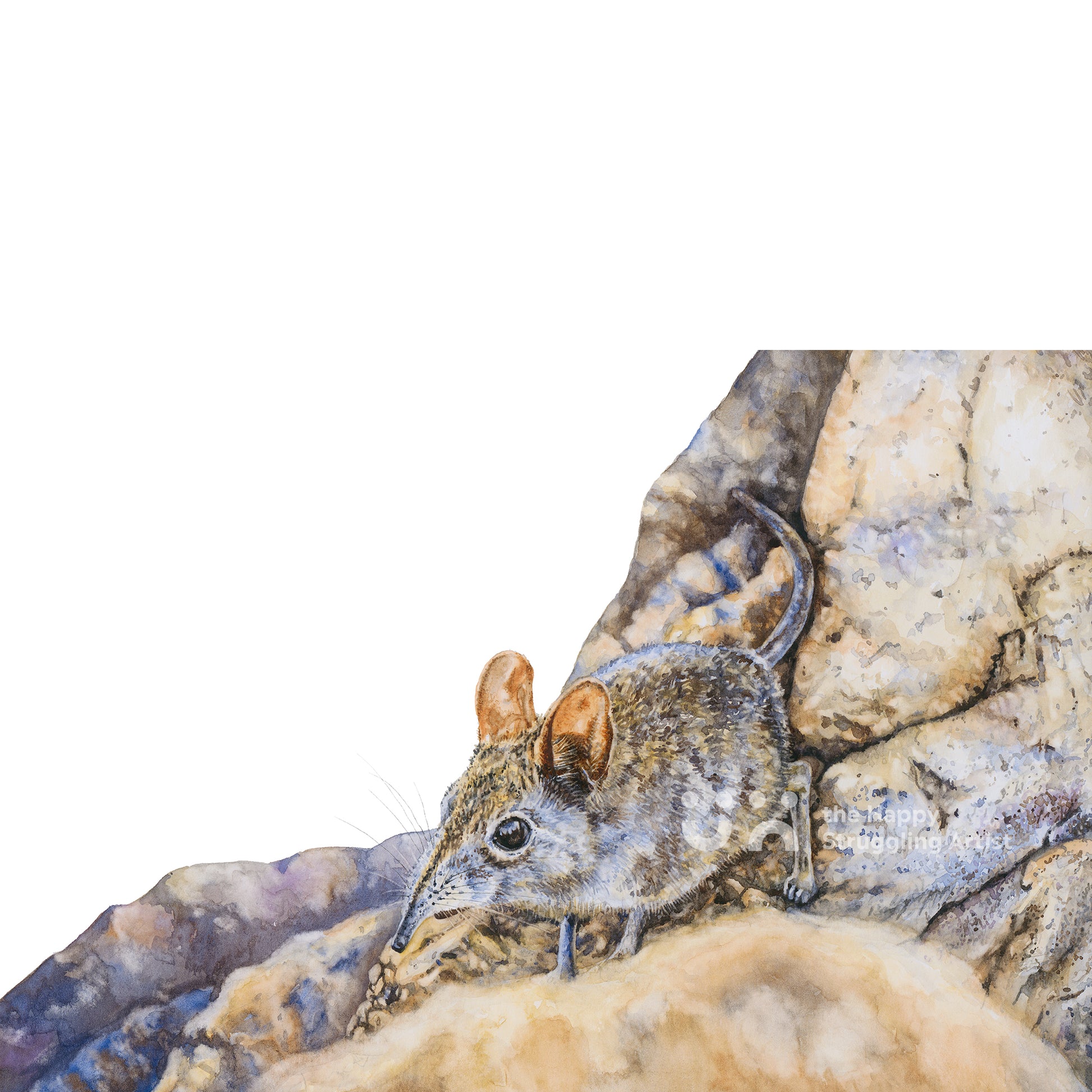 Original watercolour painting, entitled Nosy, featuring a photo-realistic rendition of an Eastern Rock Elephant Shrew/Sengi.