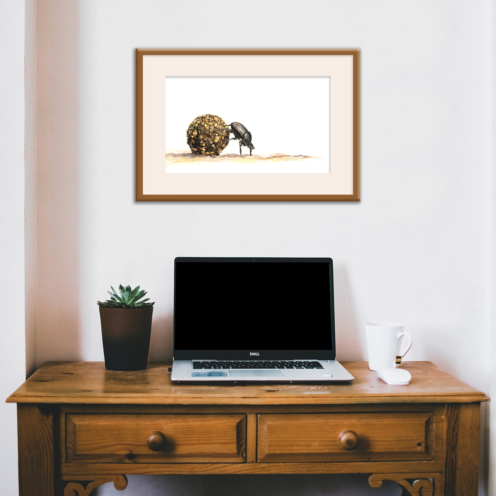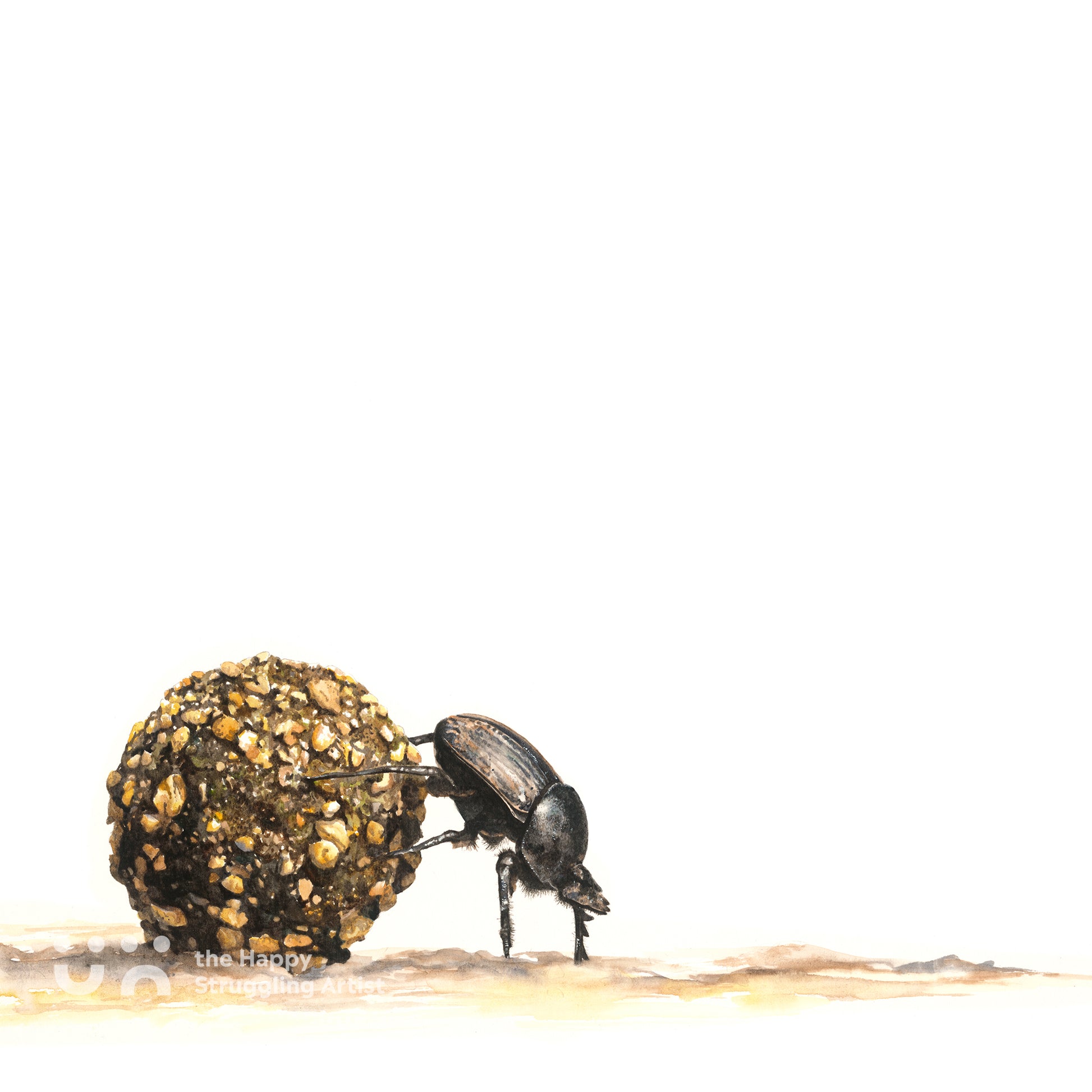 Fine art print of my watercolour painting, entitled Padkos (Afrikaans for "Road Food"), featuring a photo-realistic rendition of a dung beetle at work.